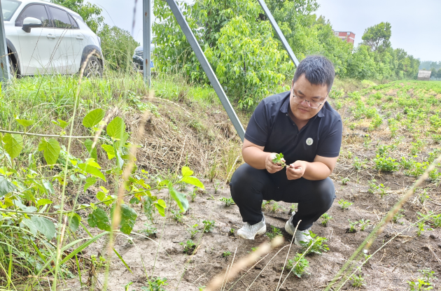 在息縣強農種植家庭農場(chǎng),服務(wù)隊與合作社負責人緊密合作,實(shí)地勘查花生田,細致評估了花生出苗及苗期生長(cháng)情況。盡管前期遭遇干旱挑戰,得益于指導合作社采取的及時(shí)灌溉與科學(xué)管理措施,夏播花生展現出良好的抗逆性,僅個(gè)別地塊出現輕微缺苗現象。針對當前麥茬春播花生普遍進(jìn)入開(kāi)花下針期的特點(diǎn),李航宇建議合作社加強田間監測,適時(shí)施用條環(huán)酸鈣、烯效唑等植物生長(cháng)調節劑,以?xún)?yōu)化植株生長(cháng)結構。同時(shí),針對高溫高濕環(huán)境下易發(fā)的葉斑病、網(wǎng)斑病等病害,他還推薦了一系列高效殺菌劑使用方案,確;ㄉ】瞪L(cháng)。