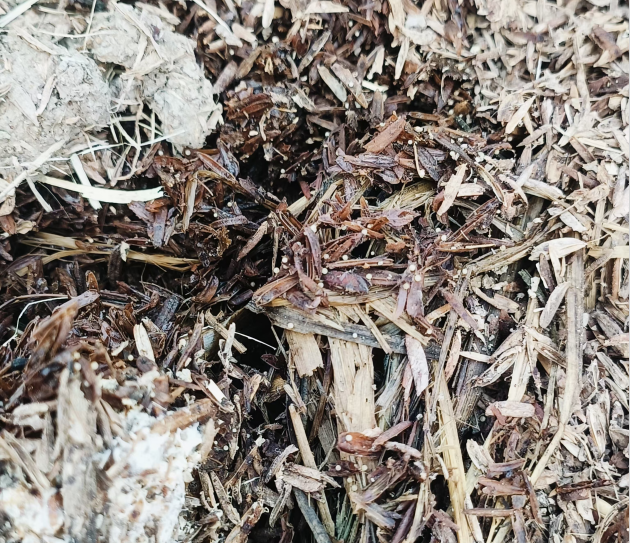 專(zhuān)家們徑直走向大球蓋菇栽培畦,通過(guò)仔細觀(guān)察發(fā)現,基地培養料干濕不勻,發(fā)菌較慢,部分料中出現米黃色小顆粒。結合詢(xún)問(wèn)基地負責人后得出結論,出現上述問(wèn)題主要是今冬天干少雨,空氣濕度低造成培養料表面偏干,氣溫偏高利于蟲(chóng)卵滋生。并提出指導性建議:一是要注意保濕,今冬持續干旱,空氣濕度過(guò)低造成培養料表面干燥加上低溫,菌絲萌發(fā)、吃料較差,可以適當補水,增加覆蓋土壤厚度保濕、保溫;二是由于第一批料在播種時(shí)遇到持續陰雨天氣,料濕度偏大菌絲生長(cháng)緩慢,要適當刺孔排濕,利于菌絲生長(cháng);三是針對部分培養料中出現的菇蚊蟲(chóng)卵現象,指導噴施高效氯氰菊酯等低毒殺蟲(chóng)藥進(jìn)行防治;四是部分干死的菌種要及時(shí)補種菌種,確保培養料發(fā)菌透料。